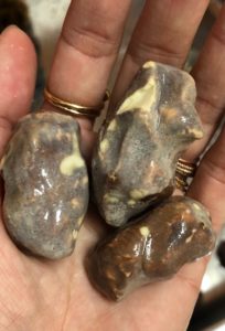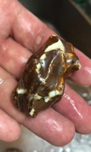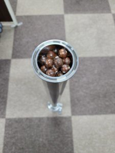 硫黄質が濃い温泉に行くと、湯船のふちや浴室内に黄土色の硫黄がたくさんくっついているのを目にするかと思いますが、管体を通ることでその硫黄の成分も小さくなることで、浴室内に蓄積する硫黄質をくっつきにくくすることができます。しかしやはり、硫黄泉そのものが勢いよく管体を通るわけですから、お玉自体にも成分がたまり膜を張ります。そうなると、お玉に塗ってある釉薬の成分が隠れてしまい、効力を発揮しなくなるのでしっかりメンテナンスもしていかないといけません。下の写真はマグネシウムとナトリウム炭酸水素塩水質の温泉でくっついた成分(左側)をきれいに取って洗った状態です。(右側)