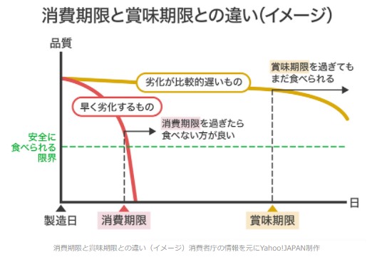 賞味期限→期限が過ぎても、劣化は緩やかで口にする場合は自分で判断できる