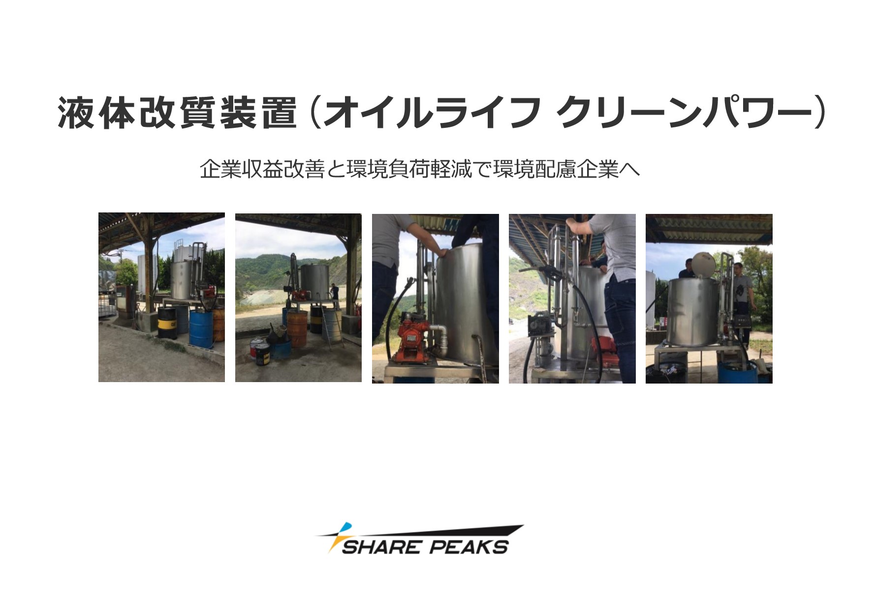 従来の燃料(ガソリン・軽油・重油)を燃料改質用HEALBOを使用した循環装置(1000Lタンク循環)にて燃料を改質し、酸素濃度をUPさせ液体改質技術で燃料成分を小さく切り分ける。その効果として、燃焼効率が上がり出力(トルク・パワー)もUP。出力が上がることで燃費改善効果が大きく期待できる。燃焼効率が上がりより燃焼(完全燃焼)しやすいことで不完全燃焼での有害な排気ガスを減少させ、黒煙の発生と排気ガスの臭気を大幅に削減させる。